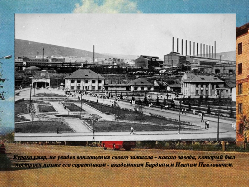 Слайд 30Курако умер, не увидев воплощения своего замысла - нового завода, который