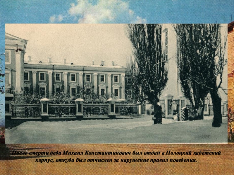 Слайд 14После смерти деда Михаил Константинович был отдан в Полоцкий кадетский корпус,