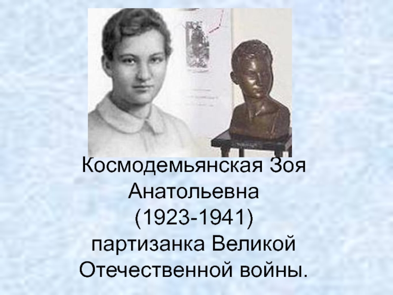 Слайд 8Космодемьянская Зоя Анатольевна (1923-1941) партизанка Великой Отечественной войны.