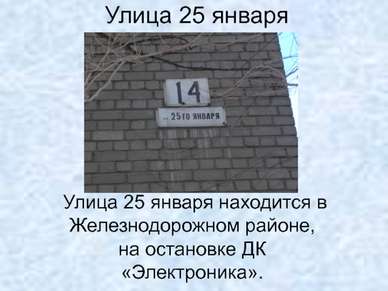 Улица 25 январяУлица 25 января находится в Железнодорожном районе, на остановке ДК «Электроника».