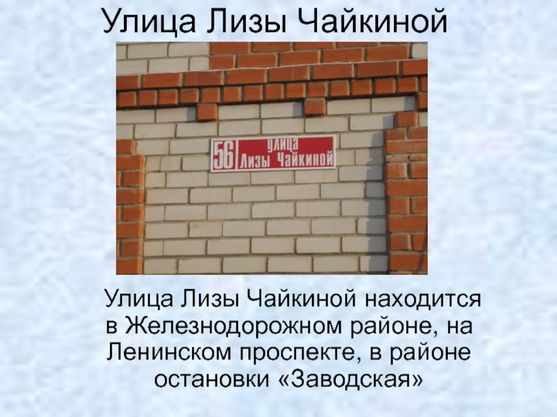 Улица Лизы Чайкиной Улица Лизы Чайкиной находится в Железнодорожном районе, на Ленинском проспекте, в районе остановки «Заводская»