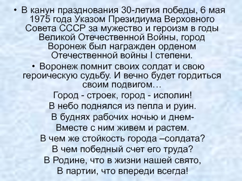 Верховного Совета СССР за мужество и героизм в годы Великой Отечественной Войны, город Воронеж был награжден орденом Отечественной войны I степени.