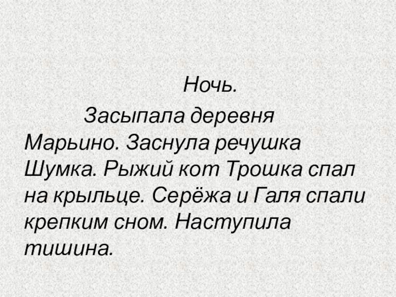 Засыпала деревня Марьино. Заснула речушка Шумка. Рыжий кот Трошка спал на крыльце. Серёжа и Галя спали крепким сном. Наступила тишина.