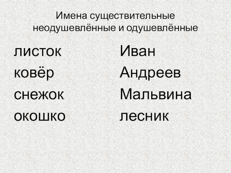 Имена существительные неодушевлённые и одушевлённыелистокковёрснежококошкоИванАндреевМальвиналесник