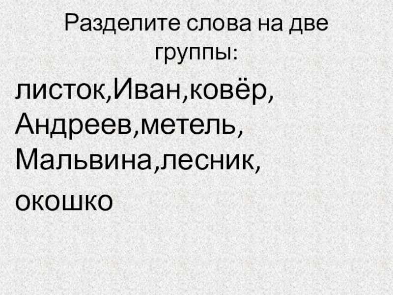 Разделите слова на две группы:листок,Иван,ковёр,Андреев,метель,Мальвина,лесник,окошко