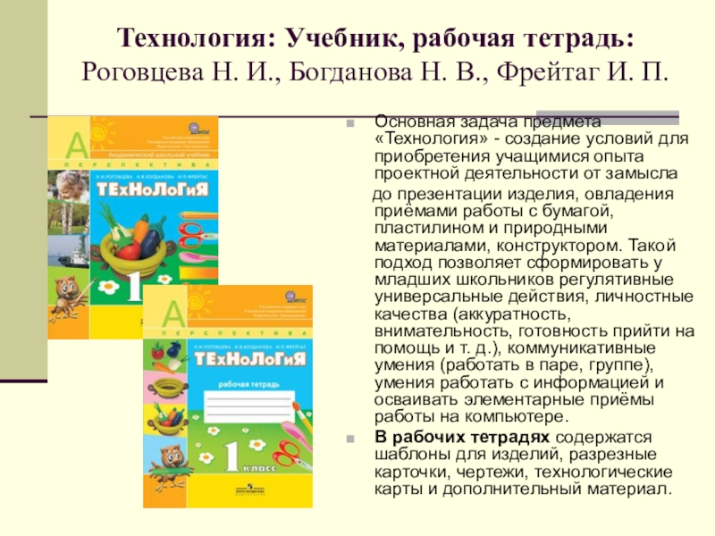 до презентации изделия, овладения приёмами работы с бумагой, пластилином и природными материалами, конструктором. Такой подход позволяет сформировать у младших школьников регулятивные универсальные действия, личностные качества (аккуратность, внимательность, готовность прийти на помощь и т. д.), коммуникативные умения (работать в паре, группе), умения работать с информацией и осваивать элементарные приёмы работы на компьютере.