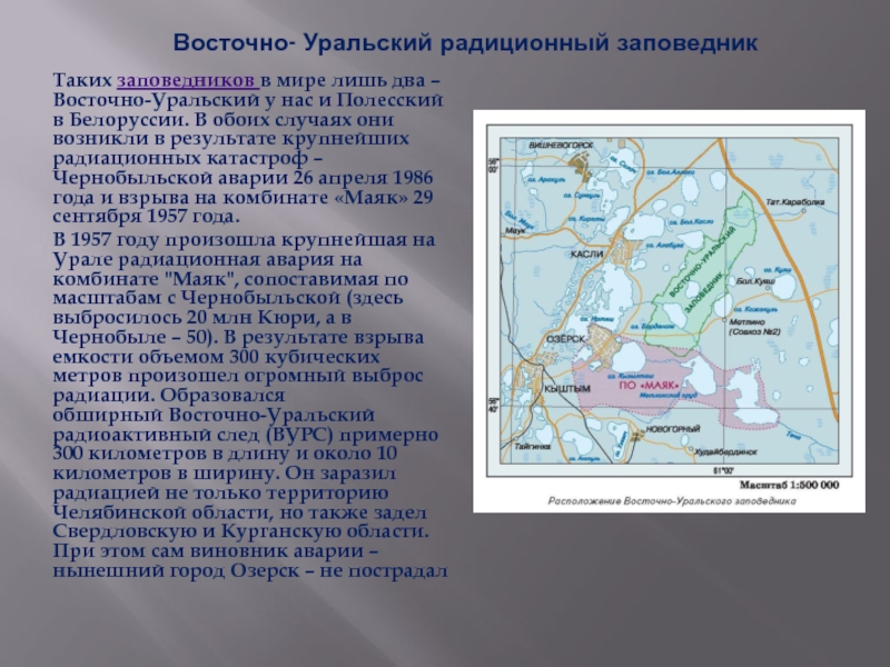 В 1957 году произошла крупнейшая на Урале радиационная авария на комбинате "Маяк", сопоставимая по масштабам с Чернобыльской (здесь выбросилось 20 млн Кюри, а в Чернобыле – 50). В результате взрыва емкости объемом 300 кубических метров произошел огромный выброс радиации. Образовался обширный Восточно-Уральский радиоактивный след (ВУРС) примерно 300 километров в длину и около 10 километров в ширину. Он заразил радиацией не только территорию Челябинской области, но также задел Свердловскую и Курганскую области. При этом сам виновник аварии – нынешний город Озерск – не пострадал