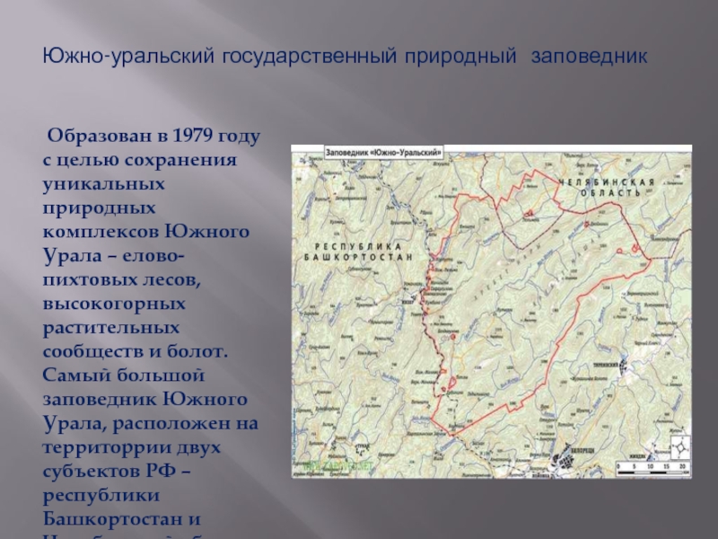 уникальных природных комплексов Южного Урала – елово-пихтовых лесов, высокогорных растительных сообществ и болот. Самый большой заповедник Южного Урала, расположен на территоррии двух субъектов РФ –республики Башкортостан и Челябинской области.