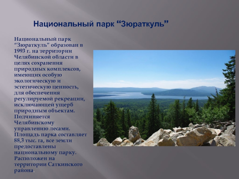 Национальный парк “Зюраткуль”Национальный парк “Зюраткуль” образован в 1993 г. на территории Челябинской области в целях сохранения природных