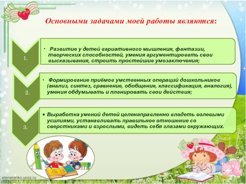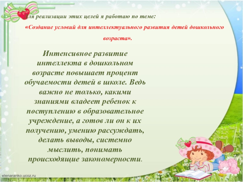 Интенсивное развитие интеллекта в дошкольном возрасте повышает процент обучаемости детей в школе. Ведь важно не только, какими знаниями владеет ребенок к поступлению в образовательное учреждение, а готов ли он к их получению, умению рассуждать, делать выводы, системно мыслить, понимать происходящие закономерности.