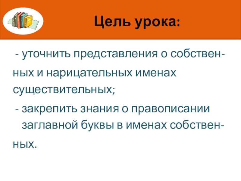Цель урока:уточнить представления о собствен-ных и нарицательных именах существительных;закрепить знания о правописании заглавной буквы в именах собствен-ных.