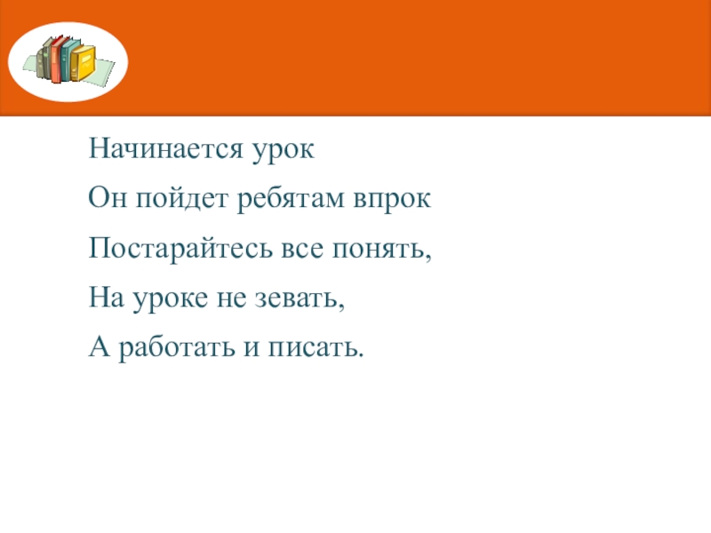 Начинается урокОн пойдет ребятам впрокПостарайтесь все понять,На уроке не зевать,А работать и писать.