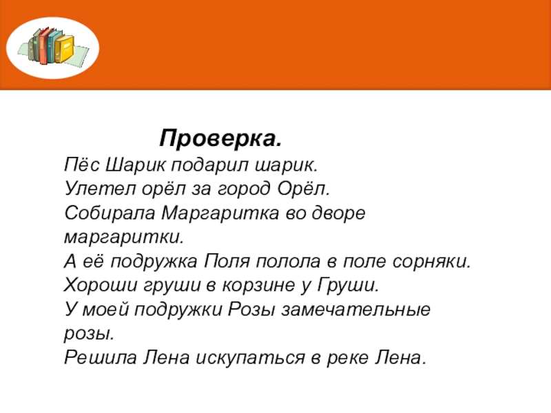 Проверка.Пёс Шарик подарил шарик.Улетел орёл за город Орёл.Собирала Маргаритка во