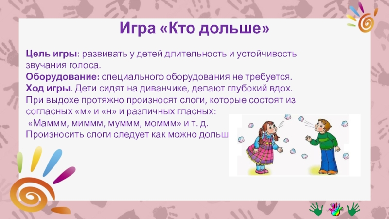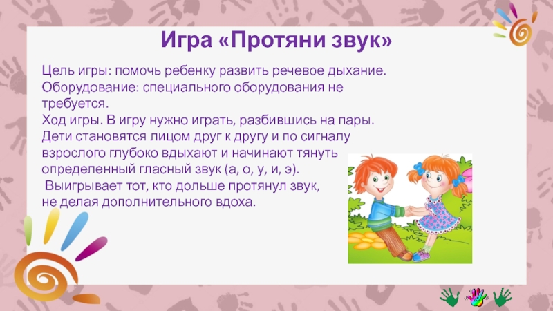Ход игры. В игру нужно играть, разбившись на пары. Дети становятся лицом друг к другу и по сигналу взрослого глубоко вдыхают и начинают тянуть определенный гласный звук (а, о, у, и, э).
