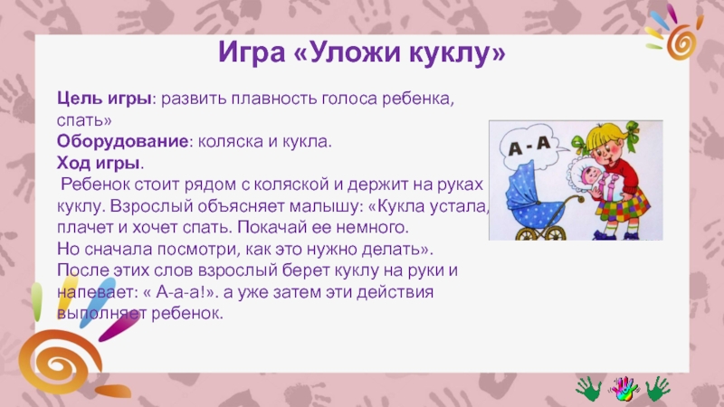 После этих слов взрослый берет куклу на руки и напевает: « А-а-а!». а уже затем эти действия выполняет ребенок.