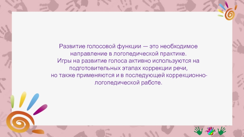 Слайд 2Развитие голосовой функции — это необходимое направление в логопедической практике.