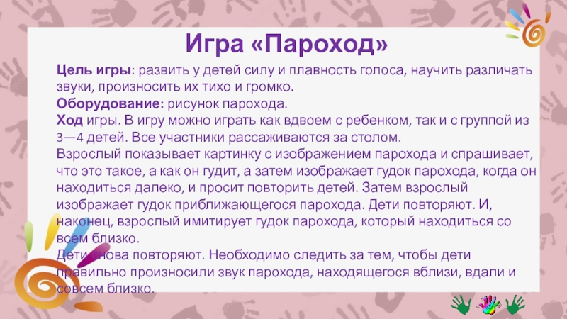 Взрослый показывает картинку с изображением парохода и спрашивает, что это такое, а как он гудит, а затем изображает гудок парохода, когда он находиться далеко, и просит повторить детей. Затем взрослый изображает гудок приближающегося парохода. Дети повторяют. И, наконец, взрослый имитирует гудок парохода, который находиться совсем близко.
