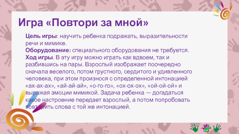 Ход игры. В эту игру можно играть как вдвоем, так и разбившись на пары. Взрослый изображает поочередно сначала веселого, потом грустного, сердитого и удивленного человека, при этом произнося с определенной интонацией «ах-ах-ах», «ай-ай-ай», «о-го-го», «ох-ох-ох», «ой-ой-ой» и выражая эмоции мимикой. Задача ребенка — догадаться какое настроение передает взрослый, а потом попробовать повторить слова с той же интонацией.