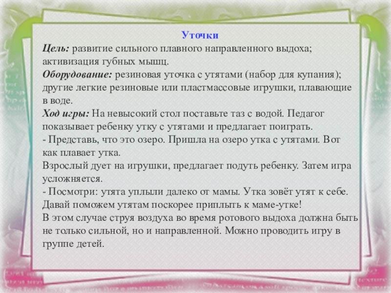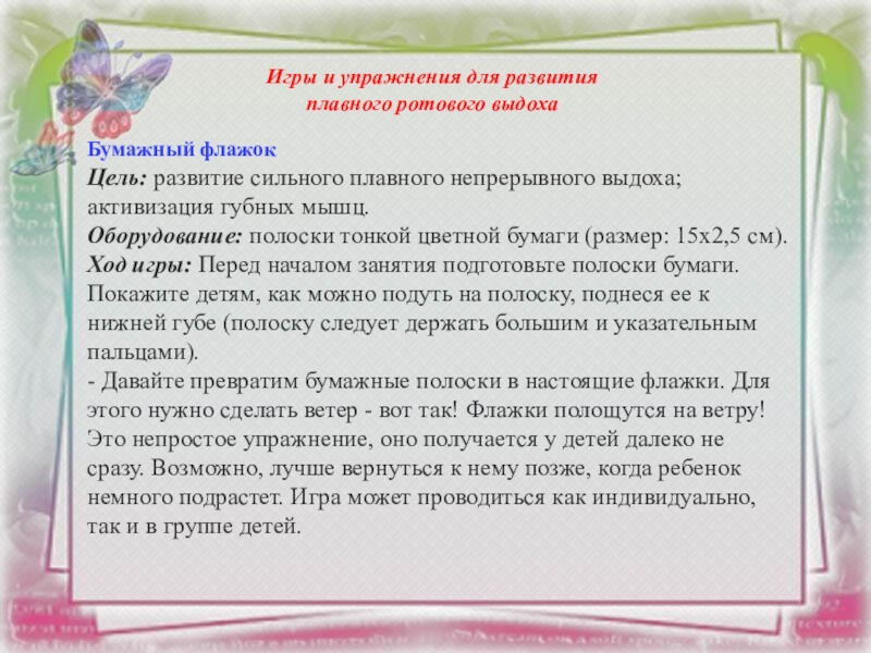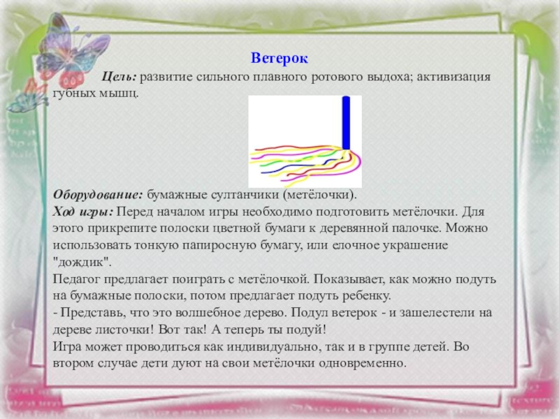 Ход игры: Перед началом занятия подготовьте полоски бумаги. Покажите детям, как можно подуть на полоску, поднеся ее к нижней губе (полоску следует держать большим и указательным пальцами).