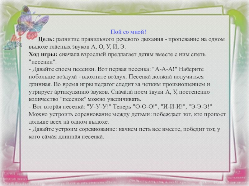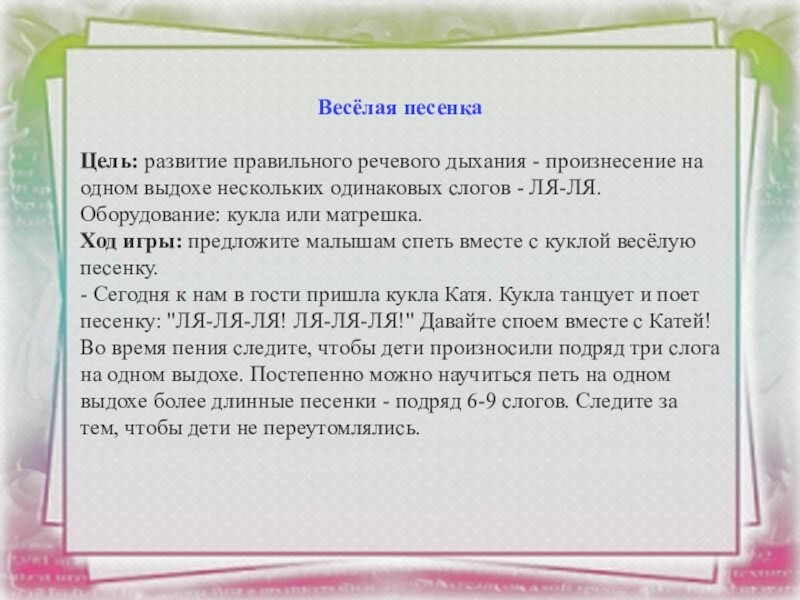 Во время пения следите, чтобы дети произносили подряд три слога на одном выдохе. Постепенно можно научиться петь на одном выдохе более длинные песенки - подряд 6-9 слогов. Следите за тем, чтобы дети не переутомлялись.