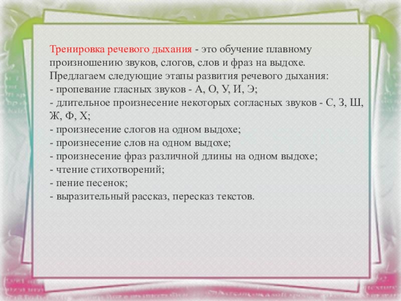 и фраз на выдохе. Предлагаем следующие этапы развития речевого дыхания: