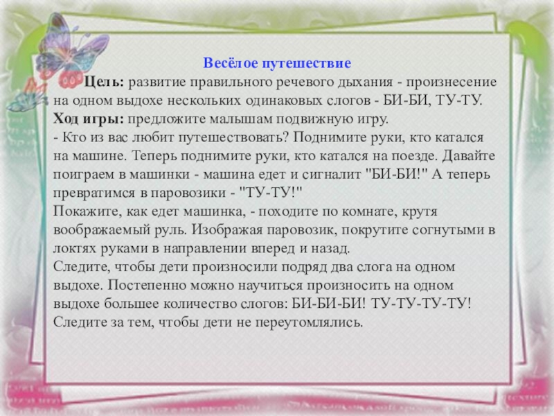 Следите, чтобы дети произносили подряд два слога на одном выдохе. Постепенно можно научиться произносить на одном выдохе большее количество слогов: БИ-БИ-БИ! ТУ-ТУ-ТУ-ТУ! Следите за тем, чтобы дети не переутомлялись.