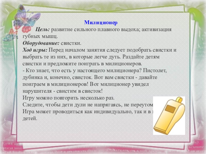 Ход игры: Перед началом занятия следует подобрать свистки и выбрать те из них, в которые легче дуть. Раздайте детям свистки и предложите поиграть в милиционеров.