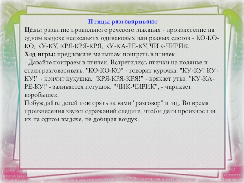 Побуждайте детей повторять за вами "разговор" птиц. Во время произнесения звукоподражаний следите, чтобы дети произносили их на одном выдохе, не добирая воздух.