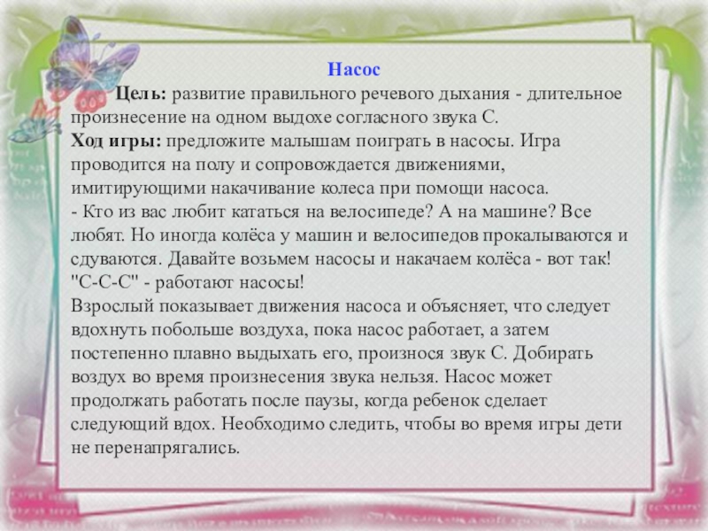 Взрослый показывает движения насоса и объясняет, что следует вдохнуть побольше воздуха, пока насос работает, а затем постепенно плавно выдыхать его, произнося звук С. Добирать воздух во время произнесения звука нельзя. Насос может продолжать работать после паузы, когда ребенок сделает следующий вдох. Необходимо следить, чтобы во время игры дети не перенапрягались.