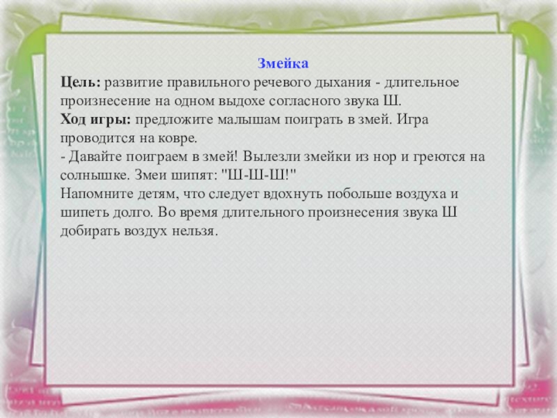 Напомните детям, что следует вдохнуть побольше воздуха и шипеть долго. Во время длительного произнесения звука Ш добирать воздух нельзя.
