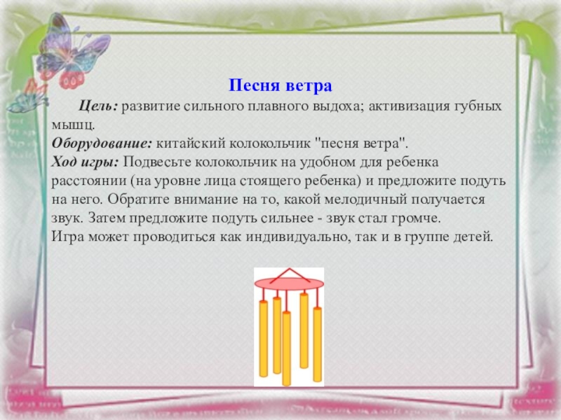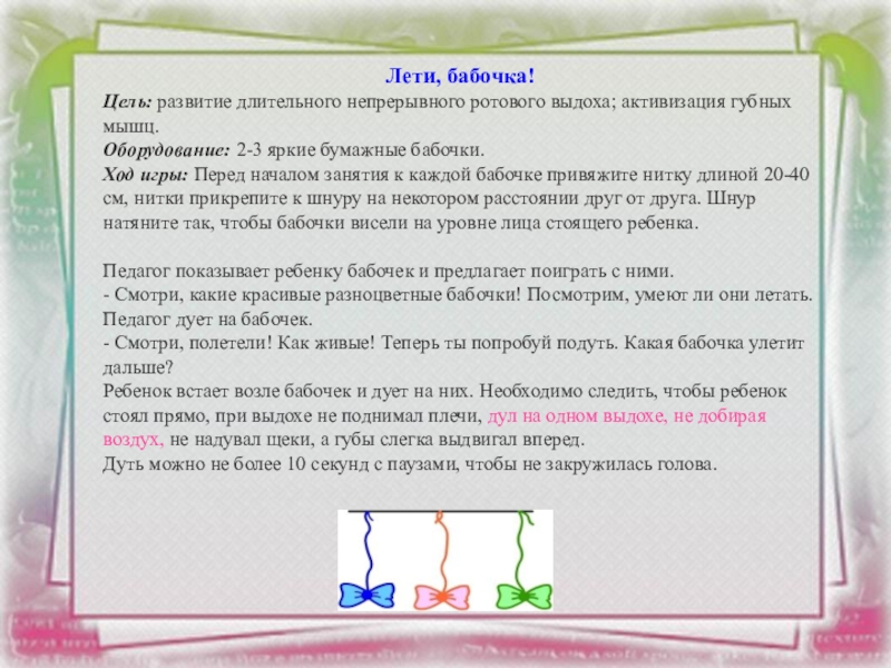Ребенок встает возле бабочек и дует на них. Необходимо следить, чтобы ребенок стоял прямо, при выдохе не поднимал плечи, дул на одном выдохе, не добирая воздух, не надувал щеки, а губы слегка выдвигал вперед.