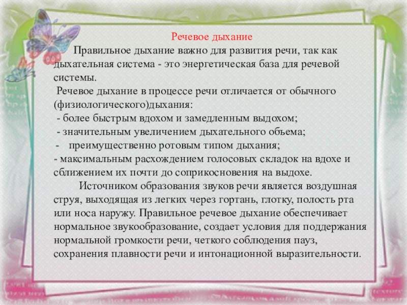 Источником образования звуков речи является воздушная струя, выходящая из легких через гортань, глотку, полость рта или носа наружу. Правильное речевое дыхание обеспечивает нормальное звукообразование, создает условия для поддержания нормальной громкости речи, четкого соблюдения пауз, сохранения плавности речи и интонационной выразительности.