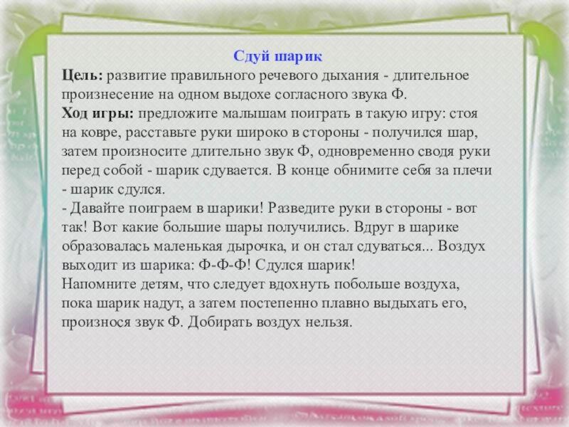 Напомните детям, что следует вдохнуть побольше воздуха, пока шарик надут, а затем постепенно плавно выдыхать его, произнося звук Ф. Добирать воздух нельзя.