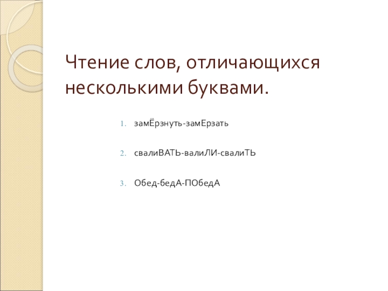 Чтение слов, отличающихся несколькими буквами.замЁрзнуть-замЕрзатьсвалиВАТЬ-валиЛИ-свалиТЬОбед-бедА-ПОбедА