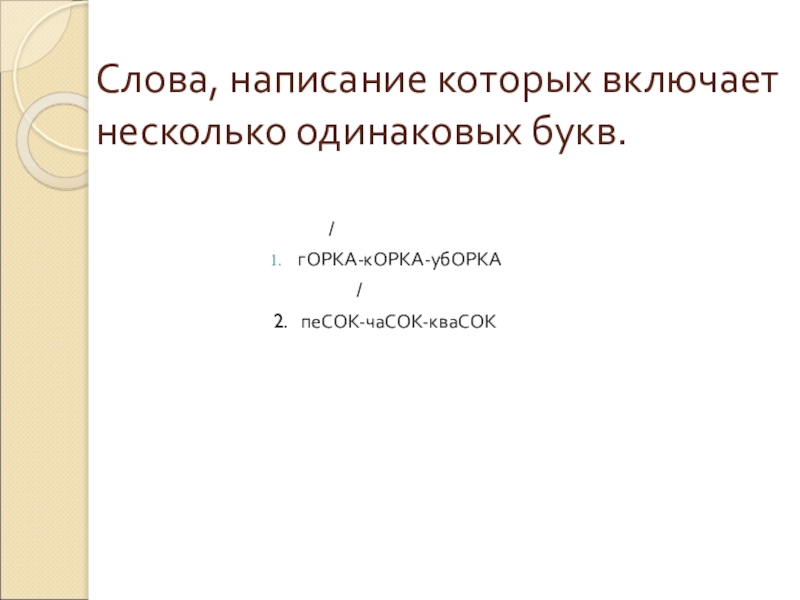 Слова, написание которых включает несколько одинаковых букв.     /гОРКА-кОРКА-убОРКА