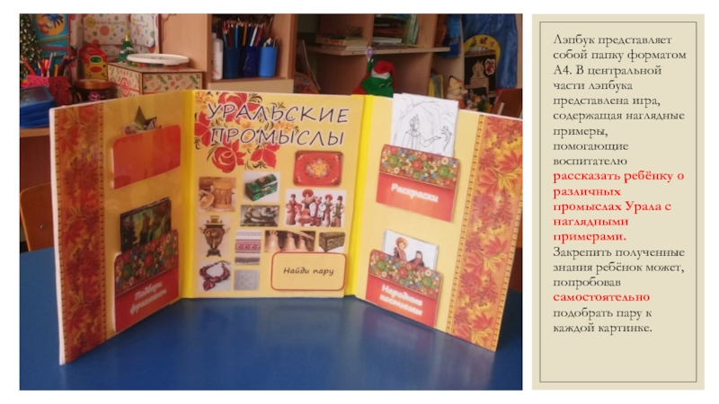 Слайд 7Лэпбук представляет собой папку форматом А4. В центральной части лэпбука представлена