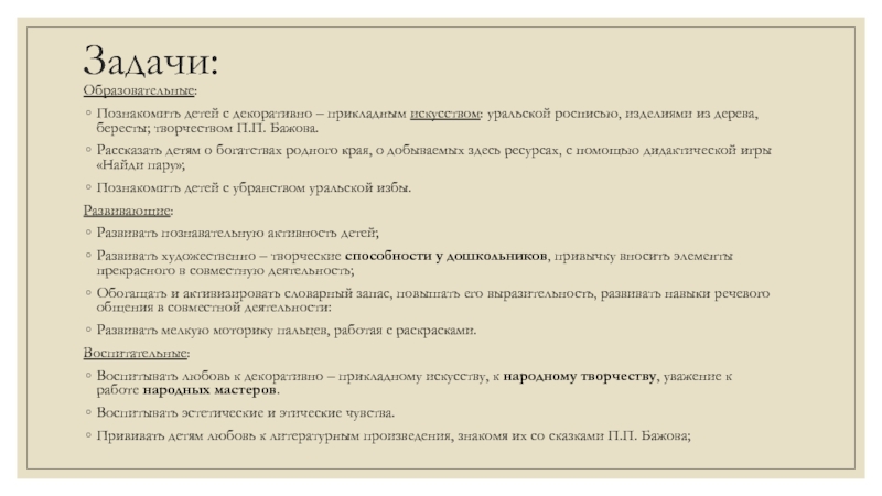 Познакомить детей с декоративно – прикладным искусством: уральской росписью, изделиями из дерева,