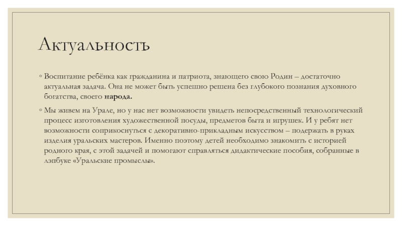 Мы живем на Урале, но у нас нет возможности увидеть непосредственный технологический процесс изготовления художественной посуды, предметов быта и игрушек. И у ребят нет возможности соприкоснуться с декоративно-прикладным искусством – подержать в руках изделия уральских мастеров. Именно поэтому детей необходимо знакомить с историей родного края, с этой задачей и помогают справляться дидактические пособия, собранные в лэпбуке «Уральские промыслы».