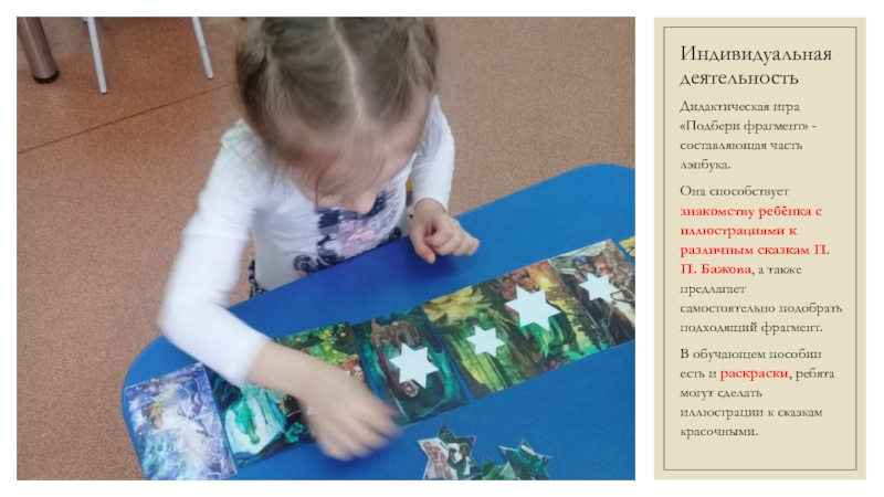 знакомству ребёнка с иллюстрациями к различным сказкам П.П. Бажова, а также предлагает самостоятельно подобрать подходящий фрагмент.