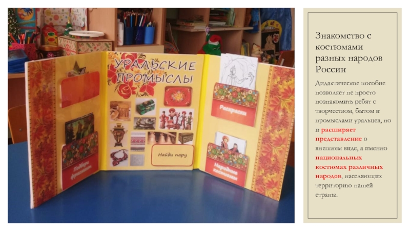 ребят с творчеством, бытом и промыслами уральцев, но и расширяет представление о внешнем виде, а именно национальных костюмах различных народов, населяющих территорию нашей страны.