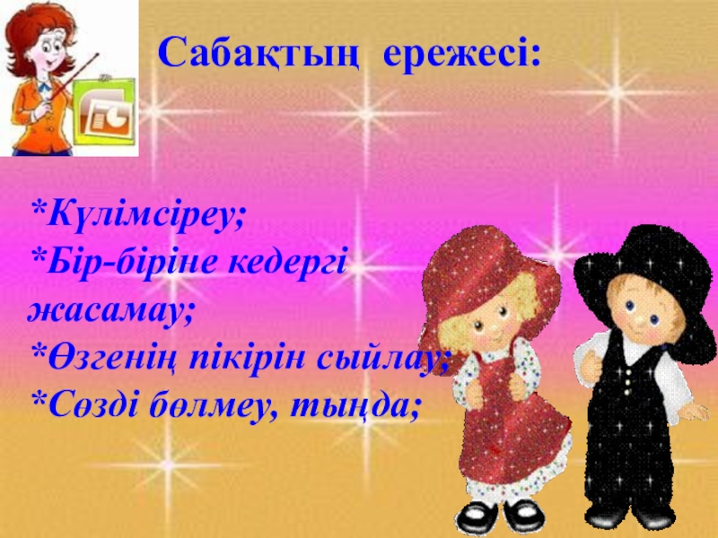 *Күлімсіреу;*Бір-біріне кедергі жасамау;*Өзгенің пікірін сыйлау;*Сөзді бөлмеу, тыңда;Сабақтың ережесі:
