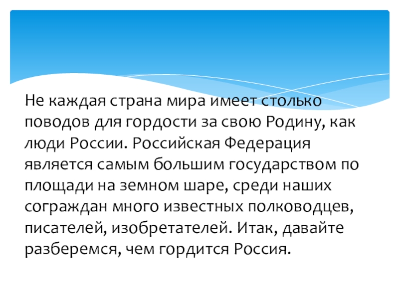Родину, как люди России. Российская Федерация является самым большим государством по площади на земном шаре, среди наших сограждан много известных полководцев, писателей, изобретателей. Итак, давайте разберемся, чем гордится Россия.