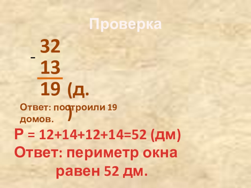 Проверка3213-19(д.)Ответ: построили 19 домов.Р = 12+14+12+14=52 (дм)Ответ: периметр окна       равен 52