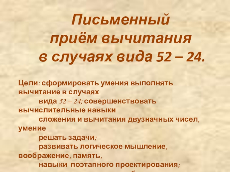Письменный приём вычитания в случаях вида 52 – 24.Цели: сформировать умения выполнять вычитание в случаях