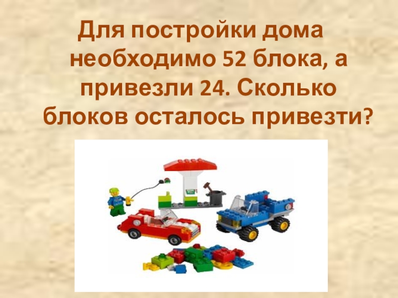 Слайд 9Для постройки дома необходимо 52 блока, а привезли 24. Сколько блоков