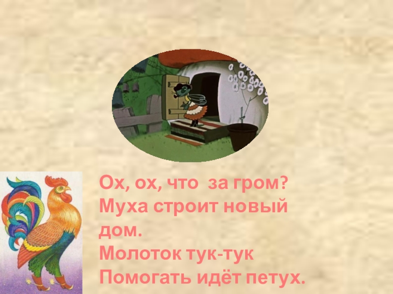 ФизминуткаОх, ох, что за гром?Муха строит новый дом.Молоток тук-тукПомогать идёт петух.