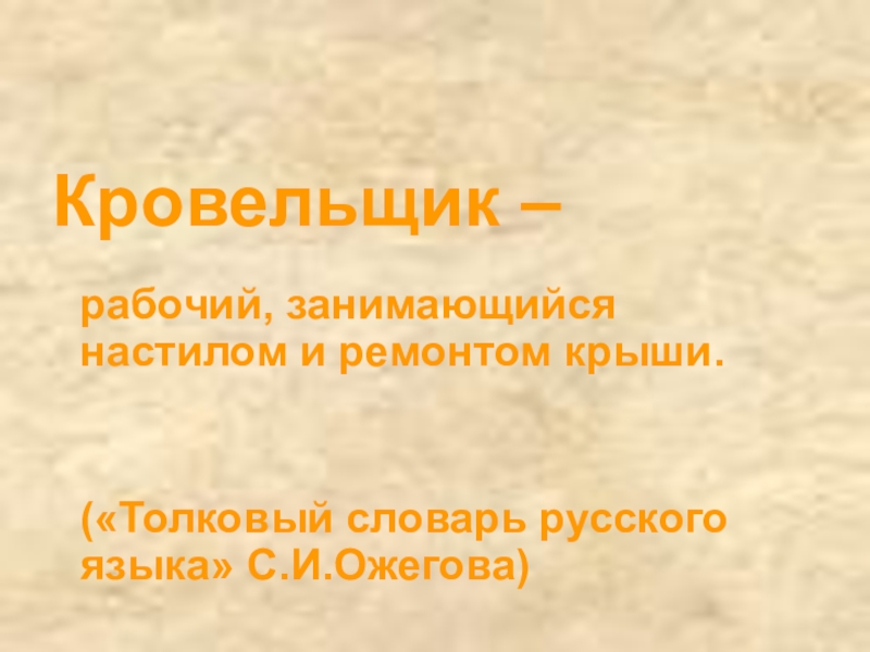 Кровельщик – рабочий, занимающийся настилом и ремонтом крыши. («Толковый словарь русского языка» С.И.Ожегова)