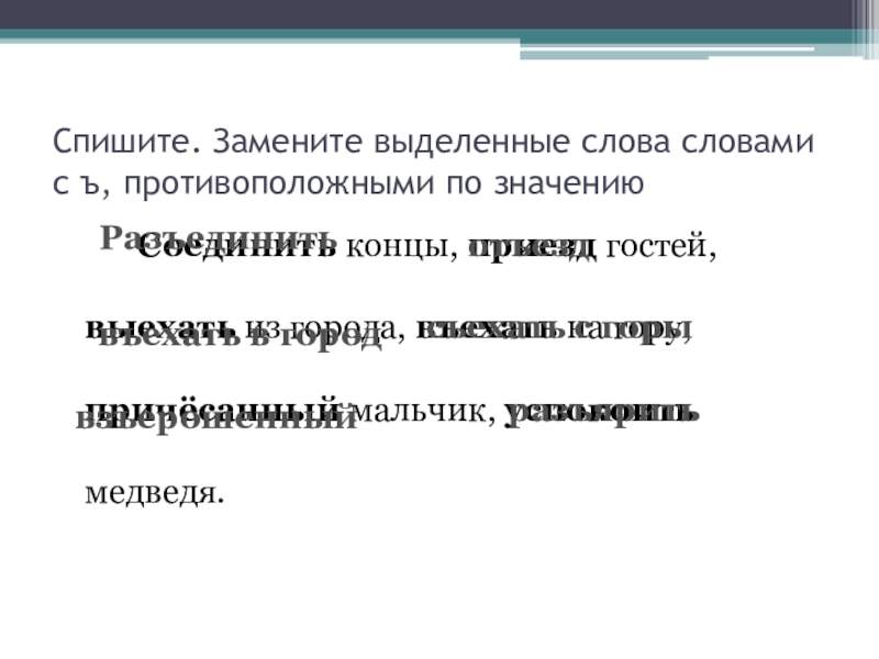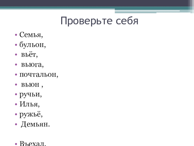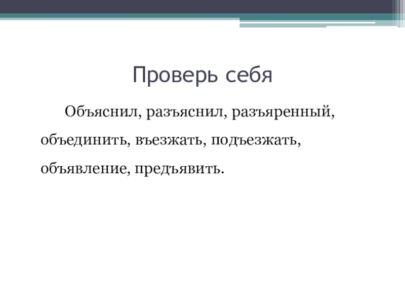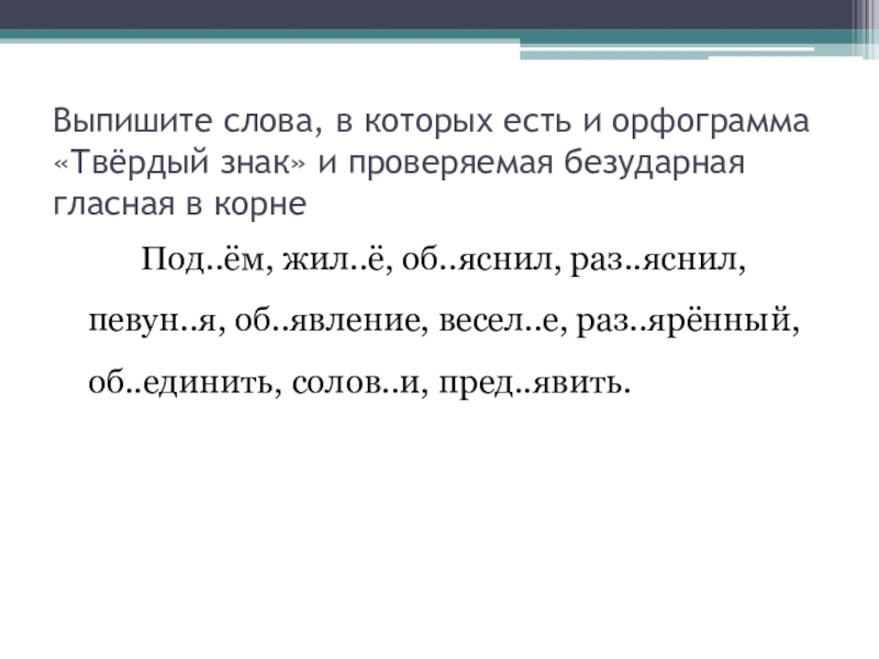 Под..ём, жил..ё, об..яснил, раз..яснил, певун..я, об..явление, весел..е, раз..ярённый, об..единить, солов..и, пред..явить.