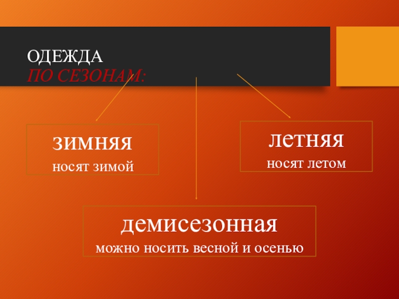 ОДЕЖДА ПО СЕЗОНАМ: зимняяносят зимойлетняяносят летомдемисезоннаяможно носить весной и осенью