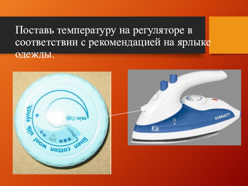 Слайд 35Поставь температуру на регуляторе в соответствии с рекомендацией на ярлыке одежды.